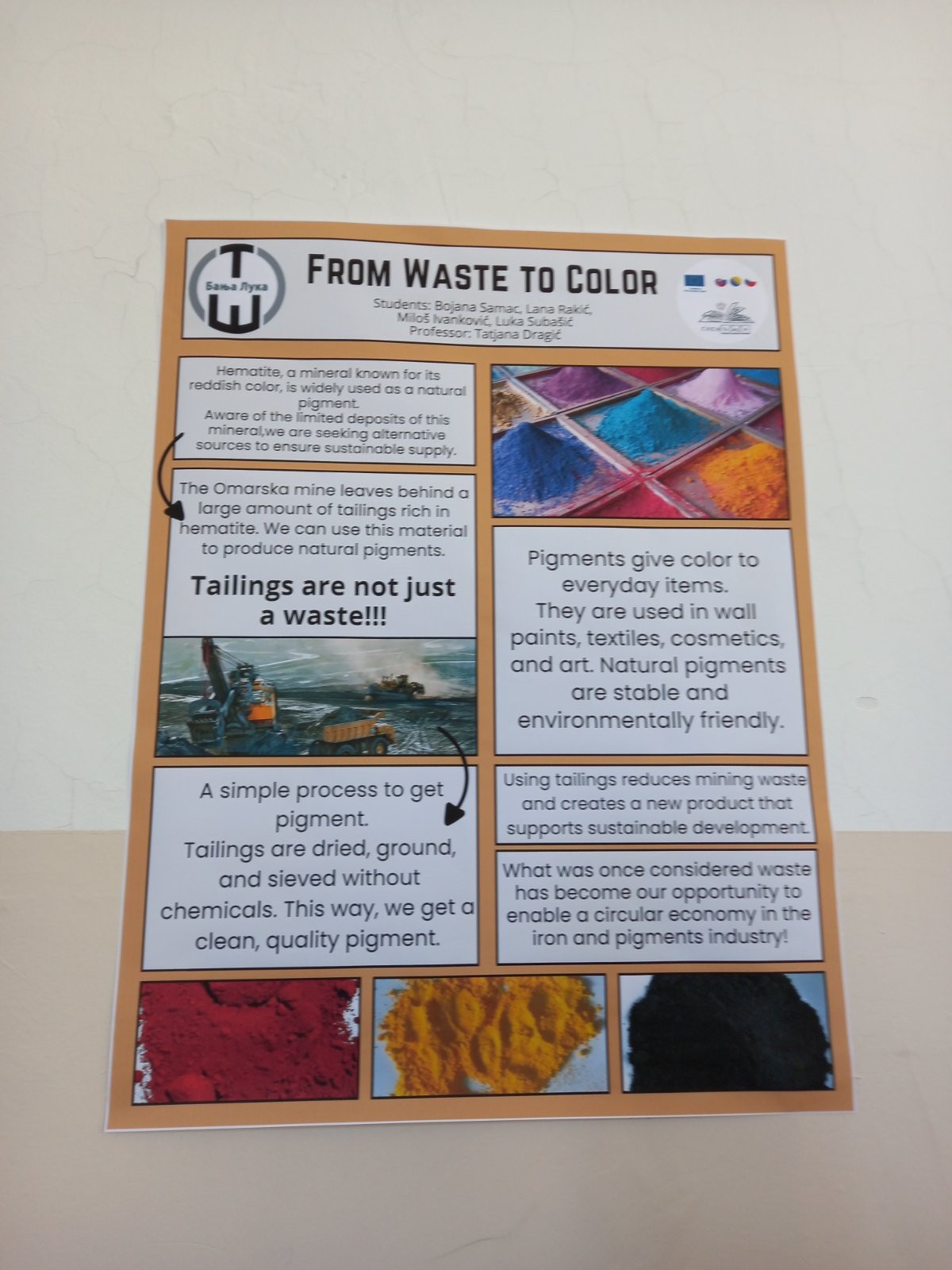 Drugi dan obuhvatio je prezentaciju učeničkih radova na zadane teme iz oblasti materijala. Učenici naše škole prezentovali su rad pod nazivom „From waste to colour„ (Od otpada-jalovine do boje), a okosnica je bio rudnik gvožđa Omarska. Učenici su prikazali mogućnost dobijanja pigmenata iz jalovine koja ostane nakon prerade rude gvožđa.